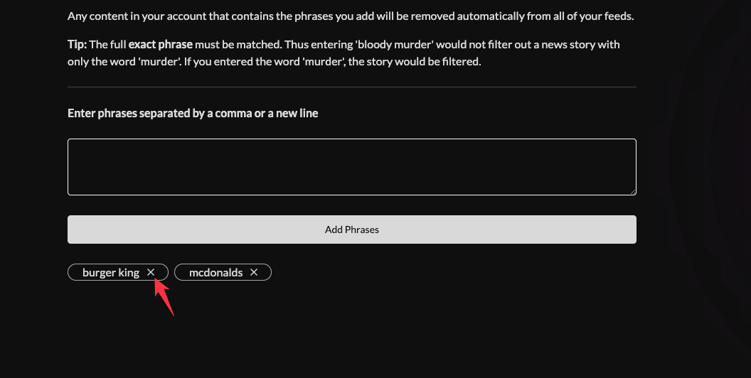 Any news content in your account that contains the phrases you add will be removed automatically from all of your feeds.