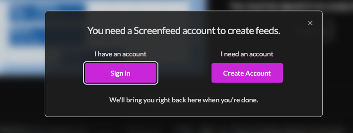 2. Since calendar feeds use your calendar data you are required to sign in to a Screenfeed account to continue creating a feed. Click continue to sign in or create an account.