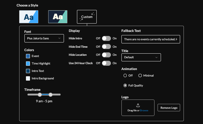 11. Choose a style from Preset Style buttons or the Custom Style button to adjust fonts, time, colors, and time frame.