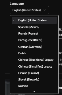 Available Languages are English, Spanish,French, Portuguese, German, Dutch, Chinese(Traditional) Chinese(Simplified) Finnish, Slovak, Russian, Czech, Croatian, Japanese, Italian, Danish, Norwegian Bokmål, Swedish