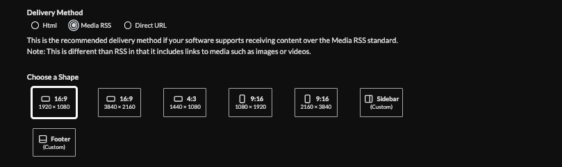 17. Select the delivery method (HTML media, RSS, or direct URL) and click "Create .Need help picking a delivery Method Learn more about advantages to each delivery method here www.screenfeed.com/support-articles/delivery-methods-available
