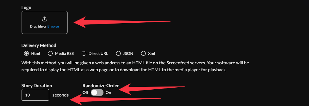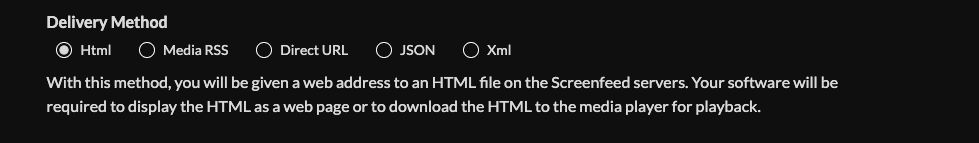 10. Select your delivery method (HTML media, RSS, direct URL, Json, or XML data).Need help picking a delivery Method Learn more about advantages to each delivery method here www.screenfeed.com/support-articles/delivery-methods-available