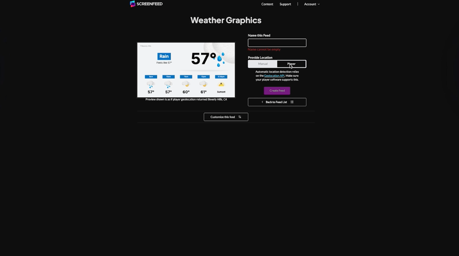3. Continue with customization of the feed or Create feed to create/save the feed with geolocation applied.