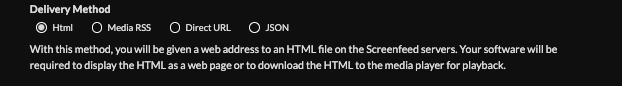 10. Set delivery method (HTML media, RSS, direct URL, Json data)Learn more about advantages to each delivery method here www.screenfeed.com/support-articles/delivery-methods-available