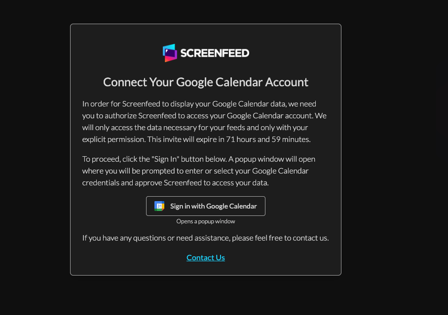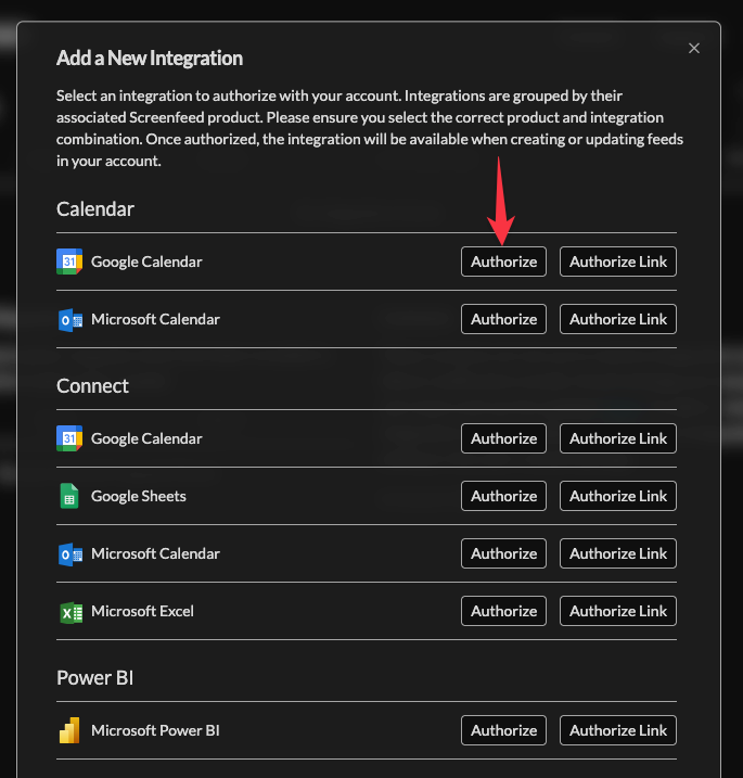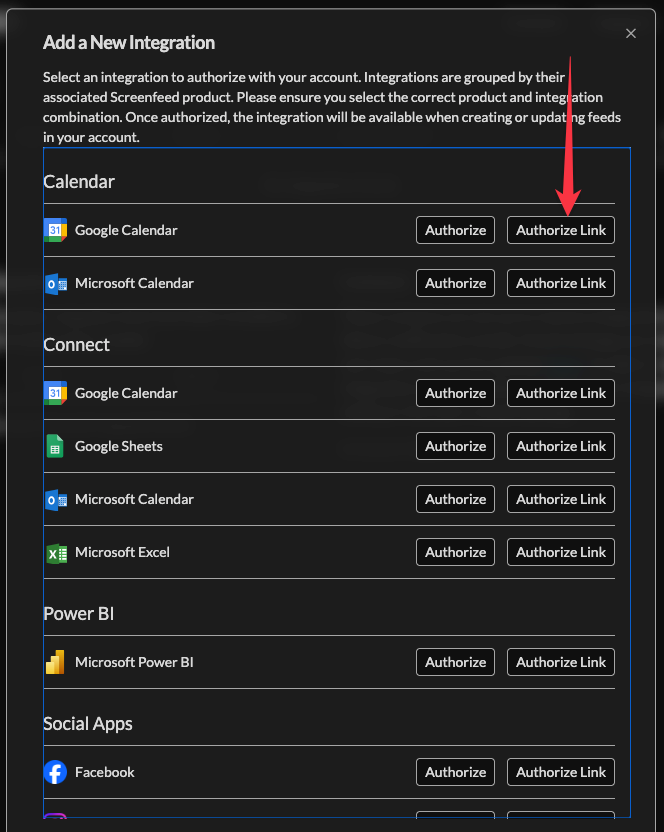 Manage your accounts external connections and authorizations using the Integrations menu. Authorize or reauthorize connections directly or with a link where the account owner can authorize without ever having to log in to the Screenfeed account.
