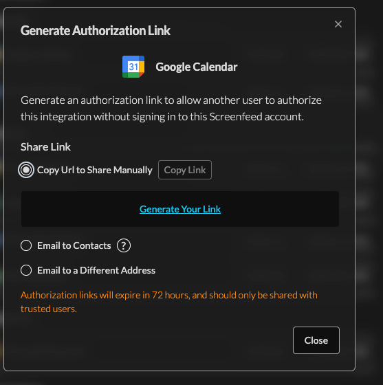 3. After a link is generated you can copy the url to send to the authorizing party, have us email to the contacts on file, or have screenfeed send the link via email to a different address.