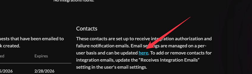 Contacts listed at the bottom of this page receive integration emails about broken connections or if there is a need to reauthorize an integration.