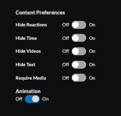 11. Set content preference, hide or show time, videos, text or require media, and enable/disable animations.