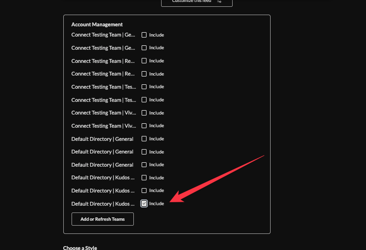 6. Check the box next to the channel you want to include. Channel names are listed as Team name| Channel name