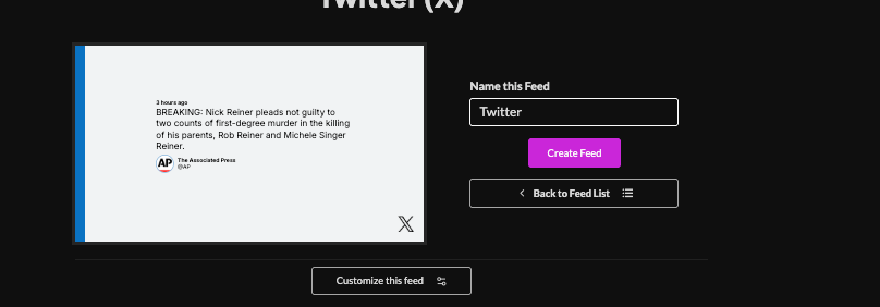 4. Enter in a twitter username/handle and click add to add to your feed. Up to three can be added to one feed. Depending on the handle it may take several hours before posts are pulled in to the feed.